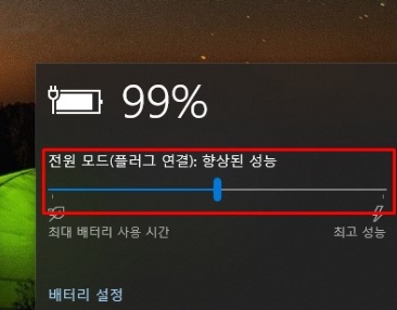 옵션은 권장설정과 절전, 고성능이 있습니다. 배터리가 거의 없다면 절전을, 배터리 상관없이 성능이 좋길 원하면 고성능을 설정해요.