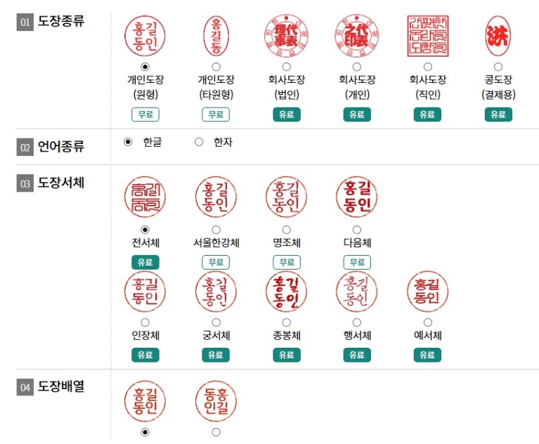 도장종류, 언어, 도장서체, 도장배열 선택합니다.