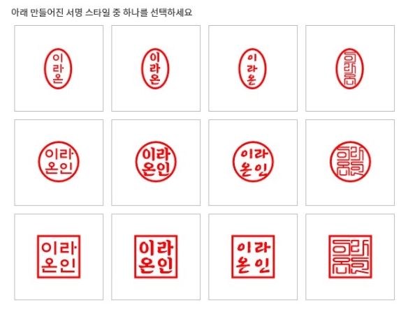전자도장만들기를 클릭합니다. 최대10자, 9가지 종류의 도장이 나옵니다. 선택하고 저장하기를 누릅니다.