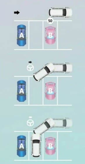 A,B차와 50cm간격으로 진입합니다. 주차하는 차가 B차 중간정도 오면 정지합니다.