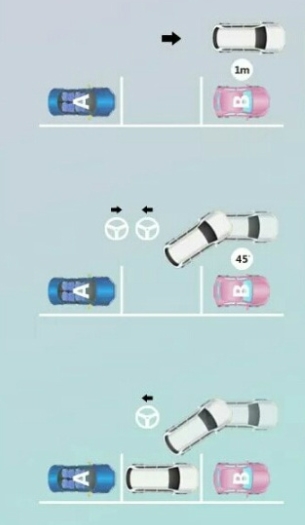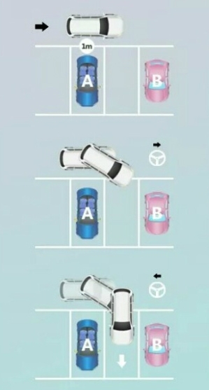 그림을 보면서 따라오세요. 주차할 차는 A,B차와 1m 간격으로 진입합니다. 주차할 차의 사이드미러가 A차의 왼쪽 끝선에 이르면 정지합니다.