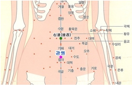 관원은 단전호흡하는 혈자리입니다. 콩팥기능을 조절하고 노폐물의 신진대사를 활발하게 해 생식과 배설을 돕습니다.
