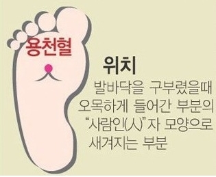 용천은 죽은 사람도 벌떡 일어나게 한다는 말이 있습니다. 자극하면 신장의 기능이 좋아집니다. 신장이 좋아지면 정력이 좋아진답니다.